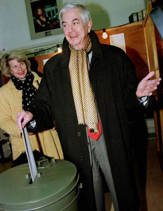 Geamuseerd kijkt actrice Femke Boersma toe terwijl haar echtgenoot Frits Bolkestein (VVD) vol drama zijn biljet in een Amsterdamse stembus deponeert. FOTO: PETER ZONNEVELD