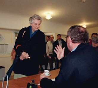 D66-lijsttrekker Els Borst maakt met de voorzitter van het stembureau in Bilthoven eerst even een praatje voordat zij haar oproepkaart afgeeft en aan het stemmen mag. FOTO: OSCAR FLOS |