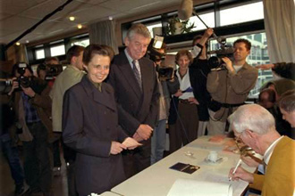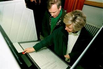 Jaap de Hoop Scheffer let goed op welke knop zijn Janine indrukt op de Haagse stemcomputer. Is de CDA-leider nog steeds haar eerste en enige uitverkorene... FOTO: ROEL DIJKSTRA