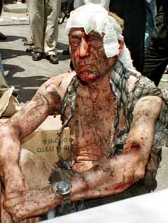 Foto: Een gewonde man zit op de markt in Jeruzalem nadat even eerder twee