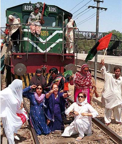 van Pakistan, bezetten het spoor bij het station van Karachi. Met luide