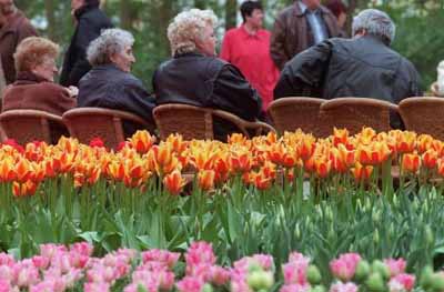 Gezellig keuvelend zitten bezoekers van de Keukenhof