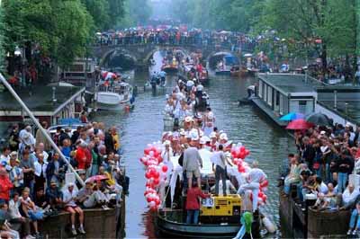De vierde Canal Parade van bijna honderd boten door de Amsterdamse grachten vormde het hoogtepunt van het homofeest Gay Pride.