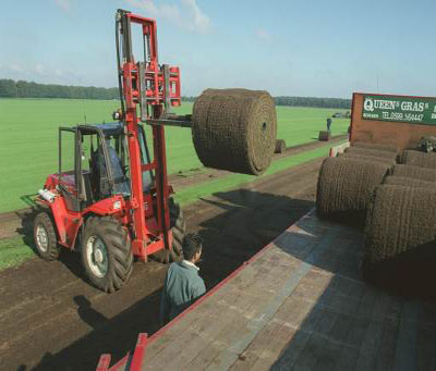 De sappige groene grasvlakte bij het Drentse Drouwen wordt in enorme zoden gesneden en opgerold. In totaal waren 20 trucks nodig om het nieuwe ArenA-veld naar Amsterdam te vervoeren. FOTO: BERT WIERINGA
