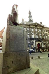 Rond het middaguur komen we aan bij het stadhuis. De gevel van zandsteen