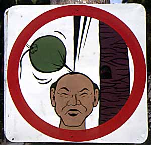 toont een foto van een waarschuwingsbord voor vallende kokosnoten uit Sri