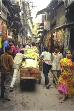 Na een paar uur in de metropool Delhi ben je al doof van het onophoudelijke getoeter. Creatief, dat wel, nog nooit hebben we zoveel verschillende melodieën gehoord. Niet dat al dat lawaai iets uithaalt, snel noch langzaam verkeer kijkt op of om, merken we aan den lijve als we met zijn vieren een autoriksja huren, een soort halfopen driewieler. Met zijn drieën persen we ons op het achterbankje waar, zagen we al, met gemak acht Indiërs een plaatsje vinden. Met afgrijzen zien we ons bijna geplet worden tussen aanstormende twee pickups die óók niet uitkijken, mishandelen we onze knieschijven voortdurend tegen de meter-die-nooit-aanstaat omdat de bestuurder pas op twee centimeter van de bumper van zijn voorganger wenst te stoppen. Met een brede grijns keert hij zich naar ons om: "Verkeersregels? Geen verkeersregels!" Kreupele Voetgangers lijken in dit chaotische gedrang helemaal op hun tellen te moeten passen. Maar wonderlijk genoeg bereikt zelfs een blinde of half kreupele ongedeerd de overkant van de straat. Net als de onverstoorbare overal opduikende heilige koeien nooit een haar wordt gekrenkt. Alsof de stromen door onzichtbare handen om hen heen geleid worden. De enigen die moeten uitkijken zijn eigenlijk wijzelf daar het verkeer op zijn Engels links rijdt. En ook daar waar slechts fietsen of karren met mensen, ezels, kamelen of paarden ervoor laveren, staan wij altijd in de weg. We genieten net in de smalle Zilverstraat van kunstig bewerkte zilveren sieraden en van de kleurrijke versieringen voor bruiloften en partijen in de Trouwstraat als we ruw opzij worden geduwd. Weg wezen! Een kar beladen met stenen kan echt niet stoppen voor een paar toeristen. Laat staan de twee mannen die een baar dragen met een onder bloemen bedolven lijk erop.