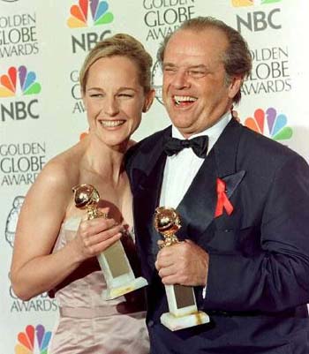 Nicholson en actrice Helen Hunt houden trots hun trofee omhoog. Hunt